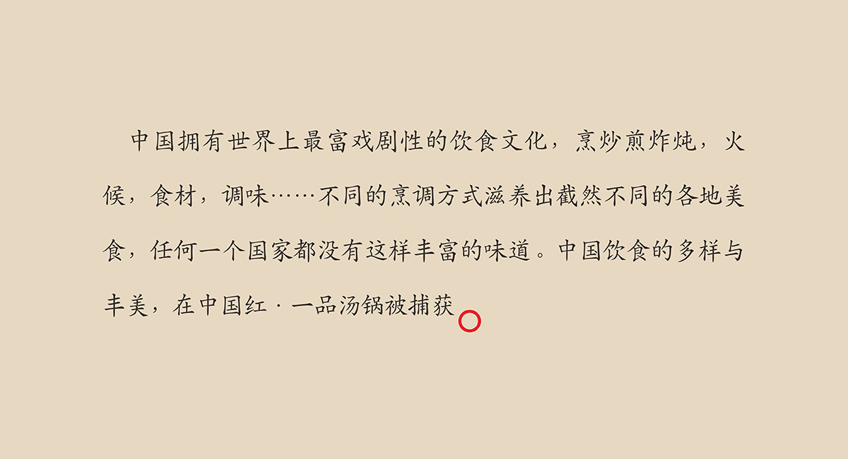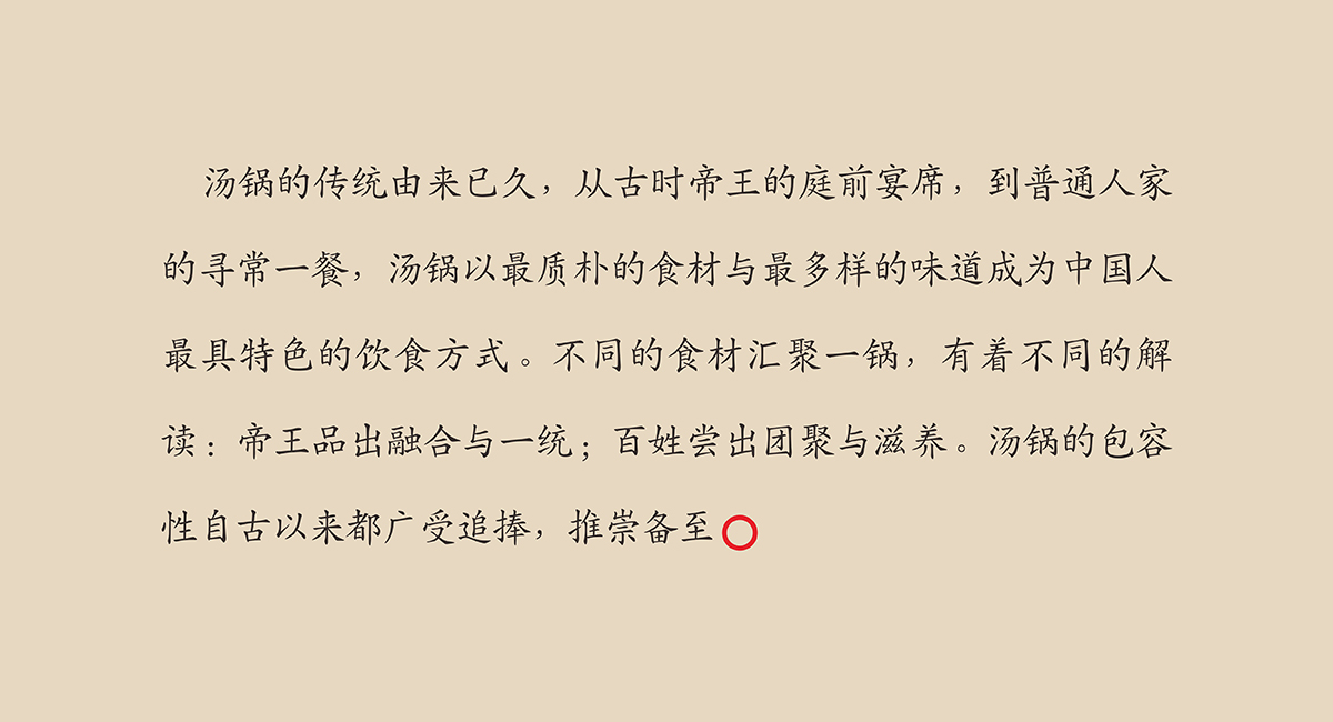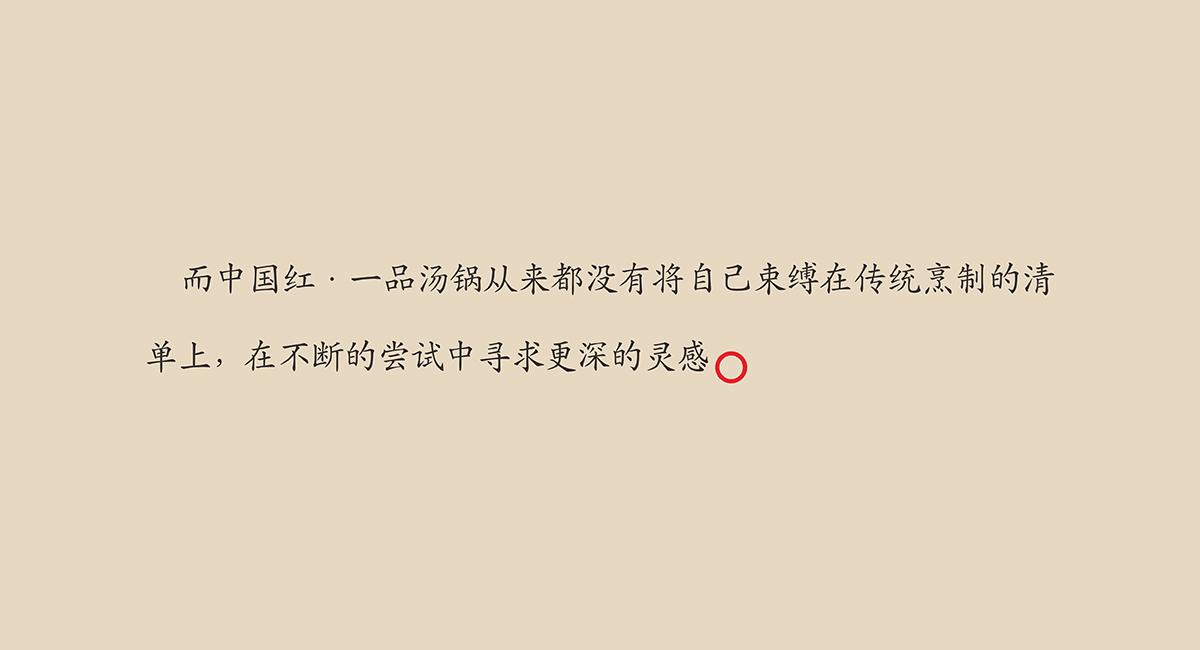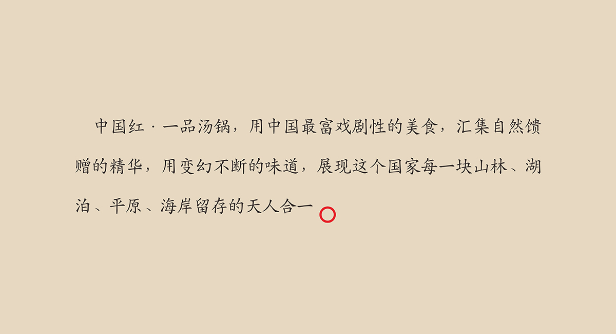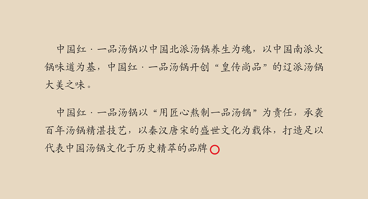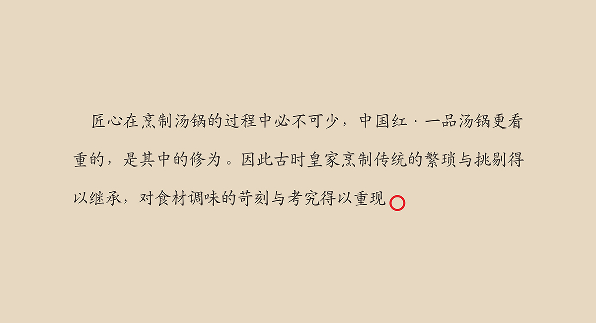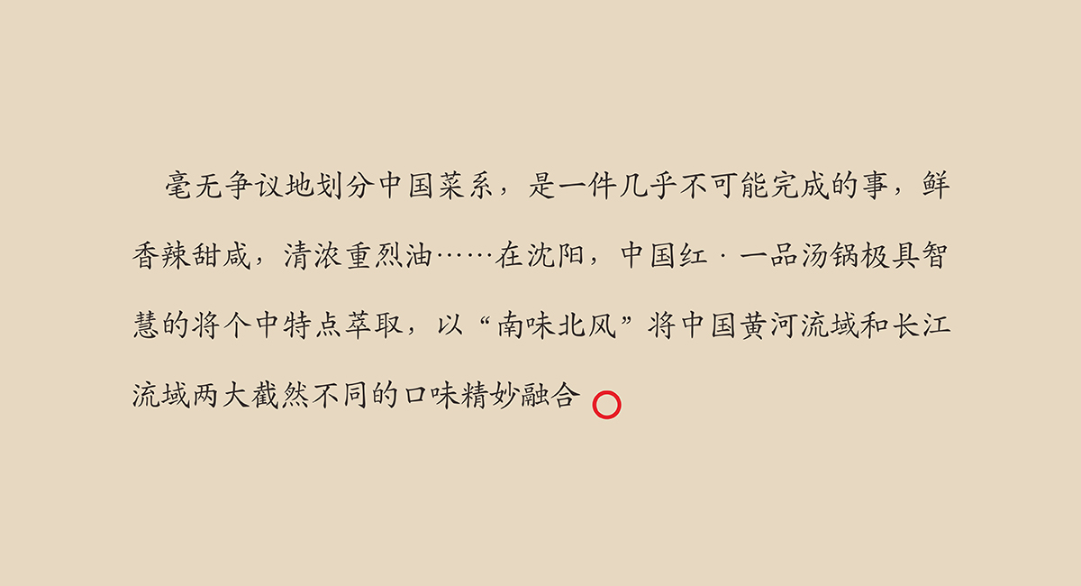 中國紅·一品湯鍋是沈陽中國紅餐飲打造的高端湯鍋品牌。產(chǎn)品以中國北派湯鍋養(yǎng)生為魂,中國南派火鍋味道為基,中國紅·一品湯鍋開創(chuàng)“皇傳尚品”的遼派湯鍋大美之味。成都九一堂商業(yè)空間設(shè)計(jì)用文化提升消費(fèi)體驗(yàn), 中國紅·一品湯鍋以“用匠心熬制一品湯鍋”為責(zé)任,承襲百年湯鍋精湛技藝,以秦漢唐宋的盛世文化為載體,打造足以代表中國湯鍋文化于歷史精萃的品牌。 中國擁有世界上最富戲劇性的飲食文化,烹炒煎炸燉,火候,食材,調(diào)味……不同的烹調(diào)方式滋養(yǎng)出截然不同的各地美食,任何一個(gè)國家都沒有這樣豐富的味道。中國飲食的多樣與豐美,在中國紅·一品湯鍋被捕獲。 湯鍋的傳統(tǒng)由來已久,從古時(shí)帝王的庭前宴席,到普通人家的尋常一餐,湯鍋以最質(zhì)樸的食材與最多樣的味道成為中國人最具特色的飲食方式。不同的食材匯聚一鍋,有著不同的解讀:帝王品出融合與一統(tǒng);百姓嘗出團(tuán)聚與滋養(yǎng)。湯鍋的包容性自古以來都廣受追捧,推崇備至。 而中國紅·一品湯鍋從來都沒有將自己束縛在傳統(tǒng)烹制的清單上,在不斷的嘗試中尋求更深的靈感。毫無爭(zhēng)議地劃分中國菜系,是一件幾乎不可能完成的事,鮮香辣甜咸,清濃重烈油……在沈陽,中國紅·一品湯鍋極具智慧的將個(gè)中特點(diǎn)萃取,以“南味北風(fēng)”將中國黃河流域和長江流域兩大截然不同的口味精妙融合。匠心在烹制湯鍋的過程中必不可少,中國紅·一品湯鍋更看重的,則是其中的修為。因此古時(shí)皇家烹制傳統(tǒng)的繁瑣與挑剔得以繼承,對(duì)食材調(diào)味的苛刻與考究得以重現(xiàn)。每一味美食都是一種禮儀,需要用虔誠才能代代相傳。中國人就是這樣,用食材與味道,將數(shù)千年歷史中的文化故事,沉淀于每一個(gè)普通人的餐桌前。當(dāng)我們細(xì)品、探尋、理解、思考其中的味覺之美時(shí),一代代中國人對(duì)飲食文化的責(zé)任與技藝飽含其中。九一堂商業(yè)空間設(shè)計(jì)將歷史美學(xué)與背景融入互動(dòng)體驗(yàn)空間設(shè)計(jì)中,中國紅·一品湯鍋,用中國最富戲劇性的美食,匯集自然饋贈(zèng)的精華,用變幻不斷的味道,展現(xiàn)這個(gè)國家每一塊山林、湖泊、平原、海岸留存的天人合一。