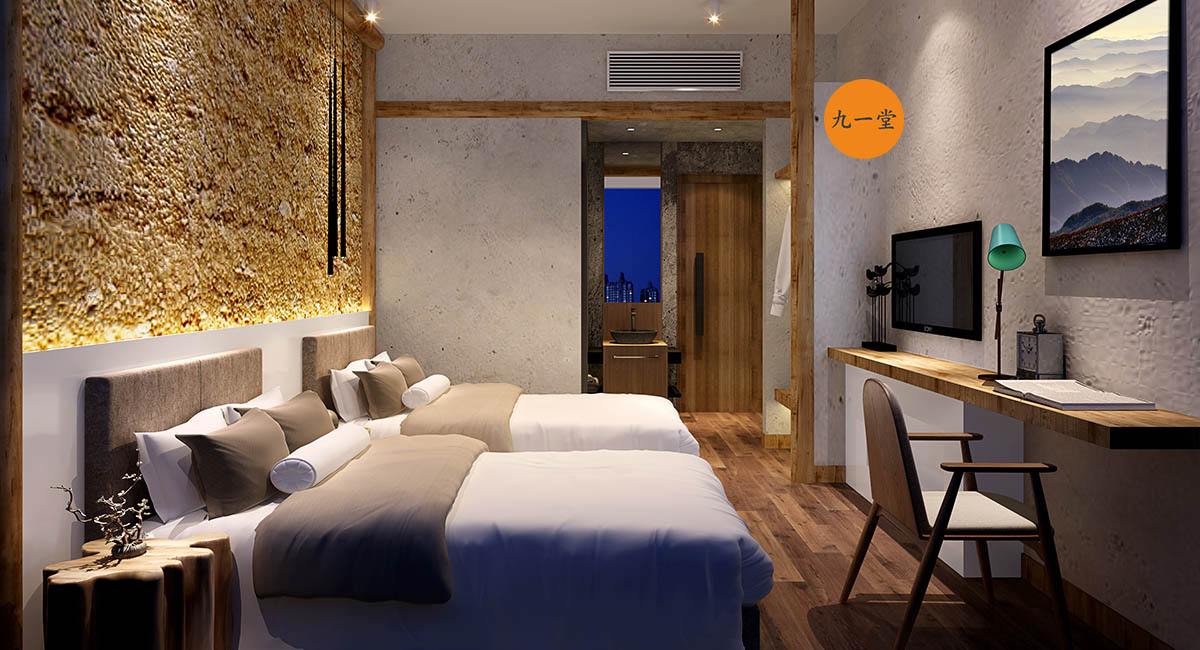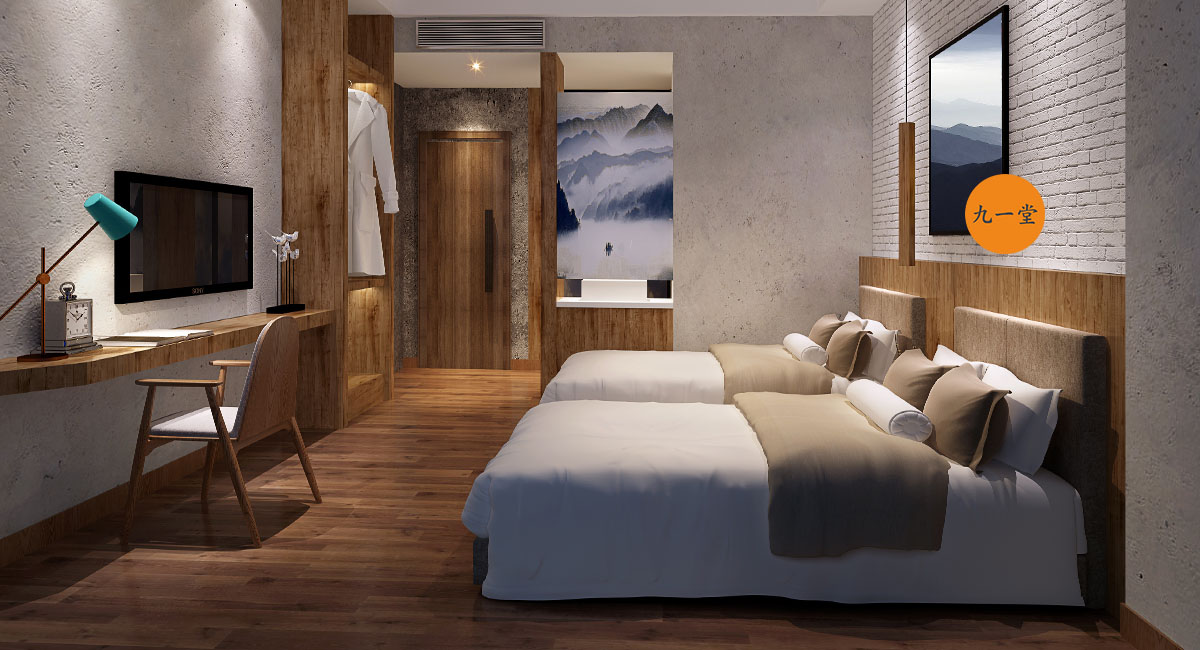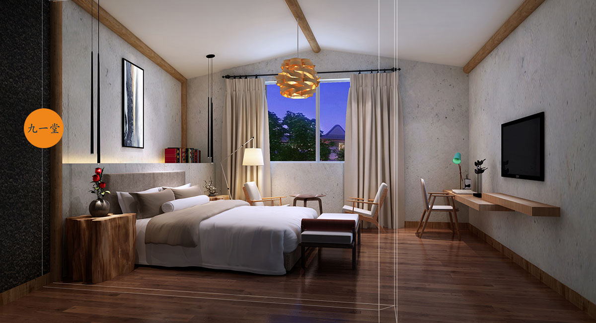 室內(nèi)空間處理上用最樸實(shí)的白色泥巴墻、原木立柱,樹墩床頭柜,最大限度還原質(zhì)樸簡(jiǎn)約生態(tài)的的手法,讓空間感受更放松更,有溫度、有感情,的木質(zhì)元素和天然材質(zhì),尊重古建筑的原有語(yǔ)言,只保留事物最基本的元素。不求華麗,旨在體現(xiàn)人與自然的溝通,營(yíng)造了一席“戶庭無(wú)塵雜,虛室有余閑”的棲息之地。木與磚空間,發(fā)聲的木板,花園打滑的石板和窗外山頭不知名卻熟悉的蟲鳴聲,還有雨季的泥土味……讓人跟著自然一起呼吸。