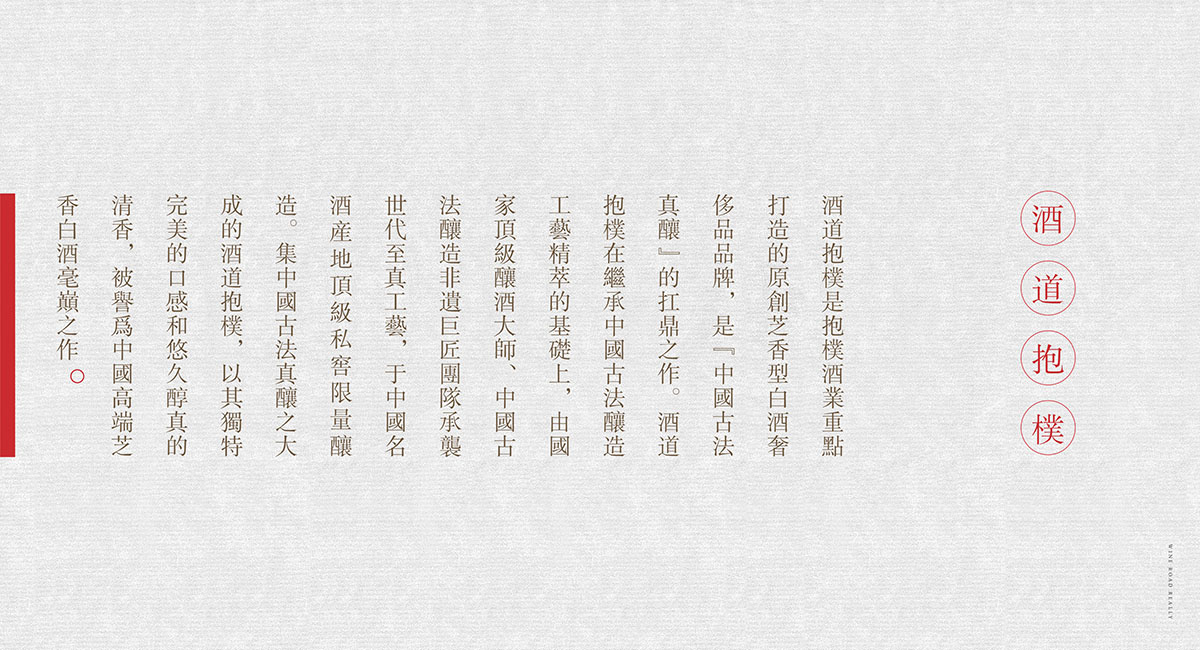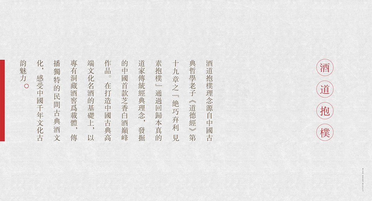 抱樸酒業是成都九一堂品牌策劃設計品牌系統全案服務客戶,前期對品牌定位策劃,品牌vi設計,產品包裝設計有了較大的成果,其中有一個重點就是酒道抱樸體驗中心的打造,整個白酒體驗中心坐落在濟南千佛山腳下,氣候陰涼,植被茂密,是儲酒的絕佳勝地,體驗中心除了對酒道抱樸文化的傳播外,還兼具餐飲,會議,沙龍,娛樂,品酒的功能.抱樸酒業堅持自己的嚴苛甄選標準,選古不選今,選老不選新,選小不選大.構成了抱樸酒業品牌的核心價值.