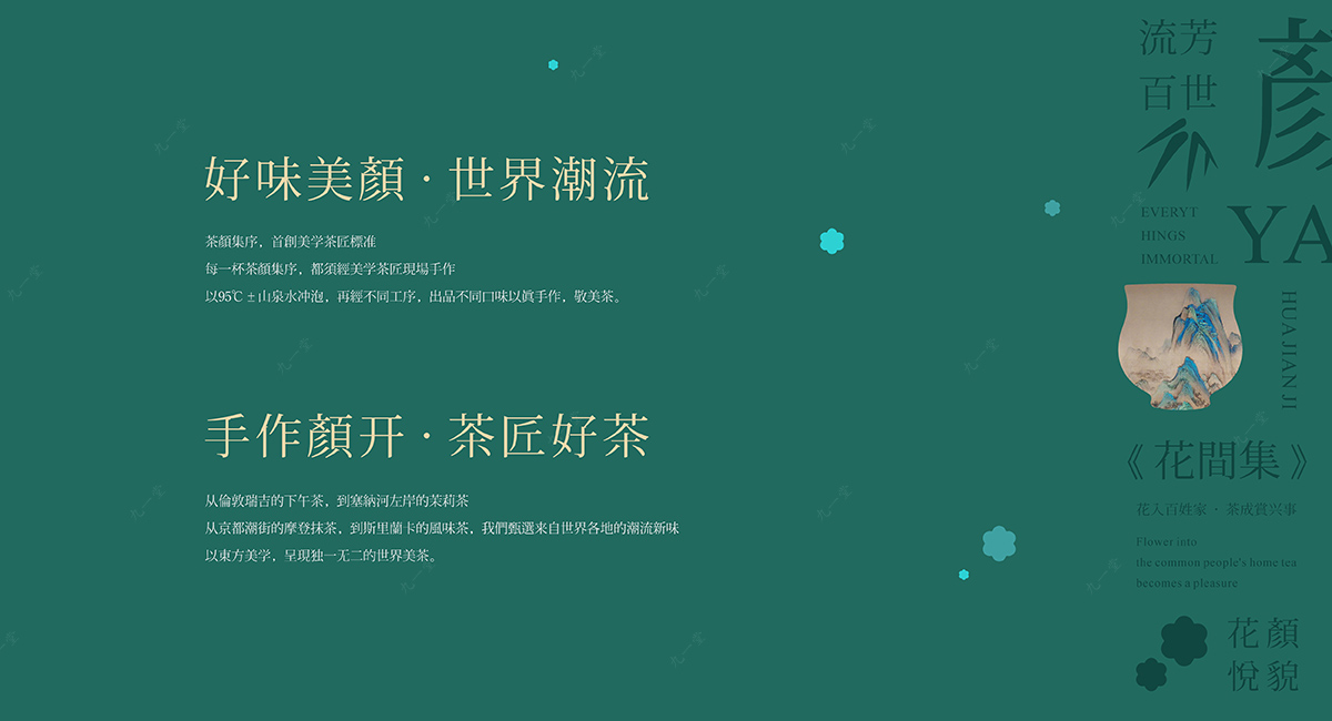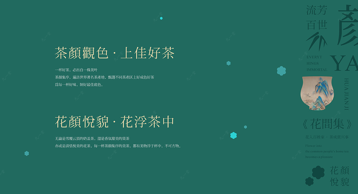 從倫敦瑞吉的下午茶,到塞納河左岸的茉莉茶,從京都潮街的摩登抹茶,到斯里蘭卡的風味茶,我們甄選來自世界各地的潮流新味,以東方美學,呈現獨一無二的世界美茶。九一堂此次設計打造的茶顏集序美學茶飲品牌,區(qū)別于傳統(tǒng)茶飲,提出美學茶品這一觀點,以東方美學呈現獨一無二的世界美茶,重新喚起茶飲品牌的東方至美風潮。
