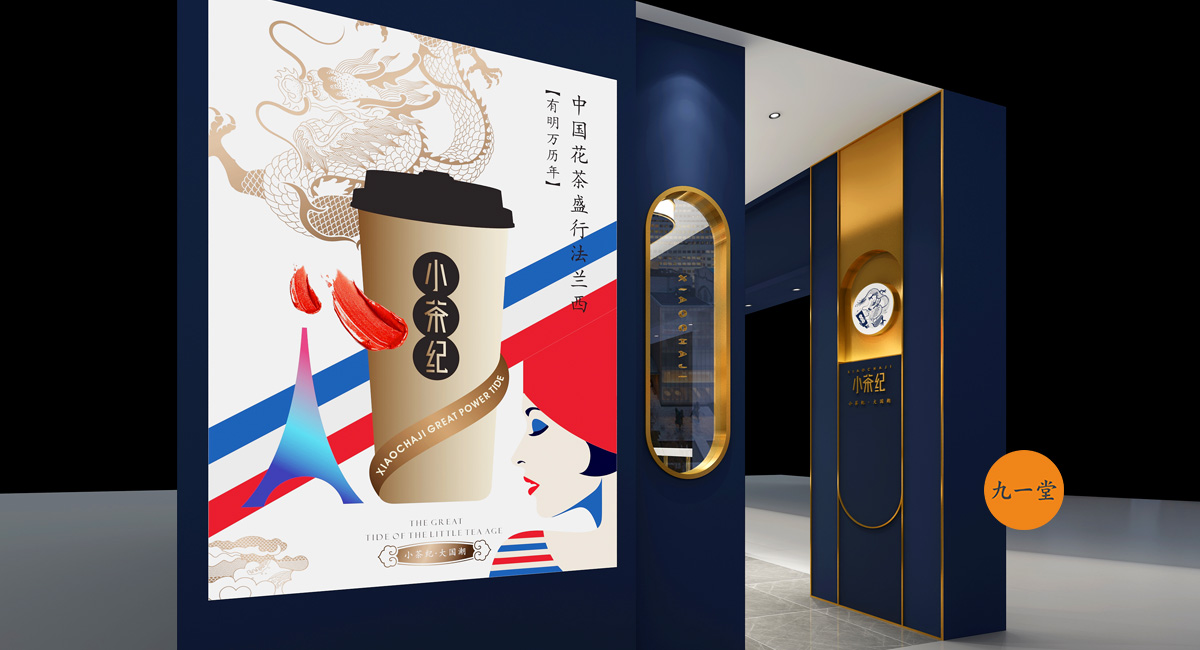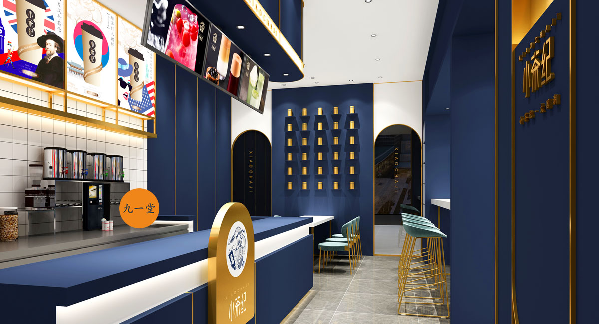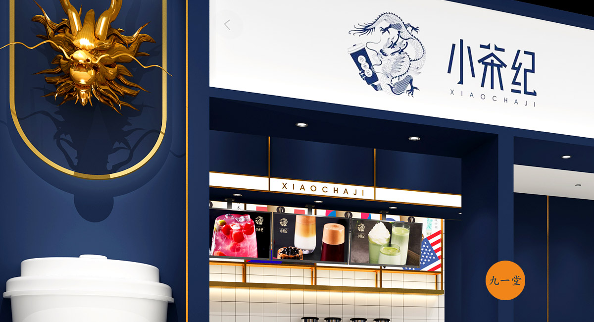 一葉神奇的東方樹葉,成為了風靡世界的中國潮。中國是茶的故鄉,成都是茶文化的起源地。小茶紀,創建于成都,用一杯小茶紀成為風靡世界的東方美茶潮流。在小茶紀的空間設計上采用深藍和金色色調,體現小茶紀品牌的沉穩的性格,但有沒有摒棄此品牌時尚的氣質,大面積鈦金的收邊提升了品牌整體品質。門頭的形象墻采用龍頭的設計契合項目的品牌定位,體現出大國的豪邁,白色杯子的運用使得整個空間時尚感十足。并且龍頭和杯子的運用在此空間中十分搶眼,是整個空間的點金之筆。