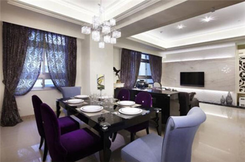 如果家里的空間較小,無法獨立安排出一個空間作為飯廳的話,不妨借鑒下這張圖中的設計。主人采用了黑色的矮柜作為分隔,既保證了空間的獨立性,有保證了室內空間的開闊性。餐廳布置得極為雅致,黑色木餐桌搭配上紫色的沙發餐椅顯得浪漫又低奢,彰顯出主人不凡的品味。