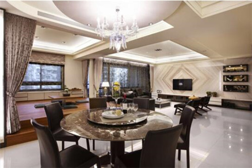 假如您家里的空間允許的話,那么就可以單獨隔出一個區域作為餐廳了。圖中是一款非常雅致的餐廳,頗具層次性的設計,讓餐廳的典雅平衡入口處的華麗氣勢,尤其古典美的圓弧天花、餐桌,細致的線條層層圍起,柔化了視覺沖擊力,并以金貝沙石材為臺面,帶出古典質感。