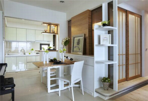 圖中這套房子面積相對小一些,房主人同樣采取了餐廚一體化的設計,這樣不會帶個人絲毫的擁擠感。半開放廚房把空間界線向后推,達到放大空間的效果,也透過拉門解決了油煙問題。裝飾色彩的運用上也很到位,木質的餐廳搭配白色的餐椅,既簡潔又充滿了溫馨感。